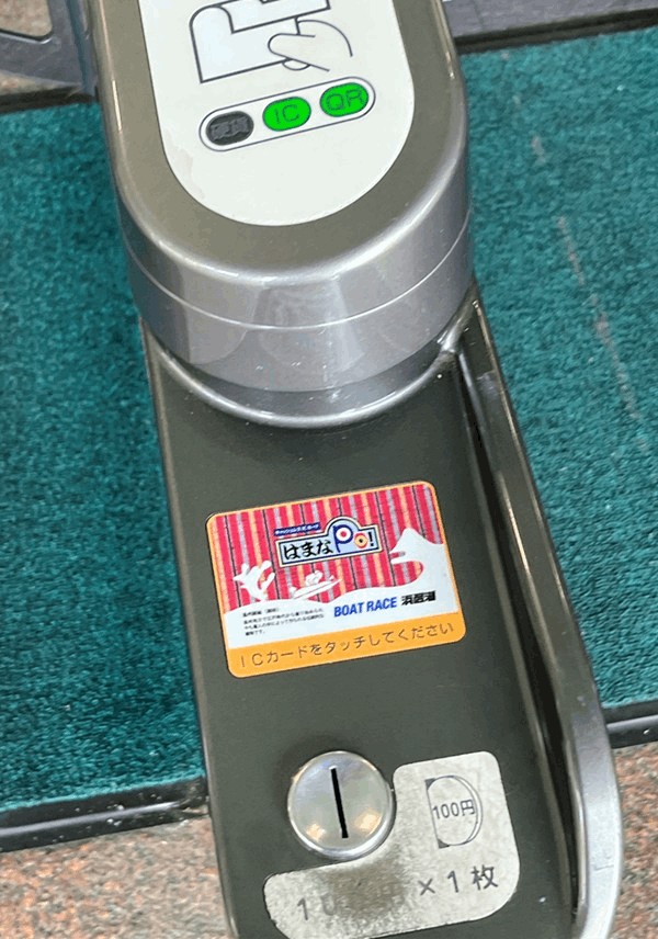 「浜名湖競艇場」の入場料は「100円」です。入場口に、100円玉を投入して入ります。もしくは専用キャッシュレスカード「はまなPo!」の場合はタッチして入場します。