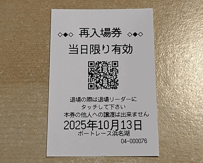 「浜名湖競艇場」の再入場方法、「再入場券」が必要